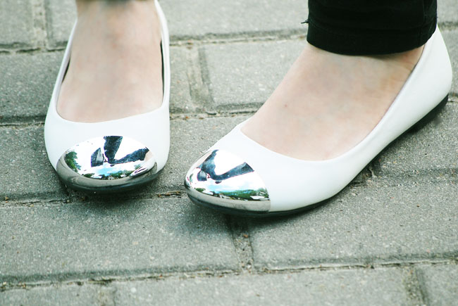 Białe balerinki ze srebrnym czubkiem